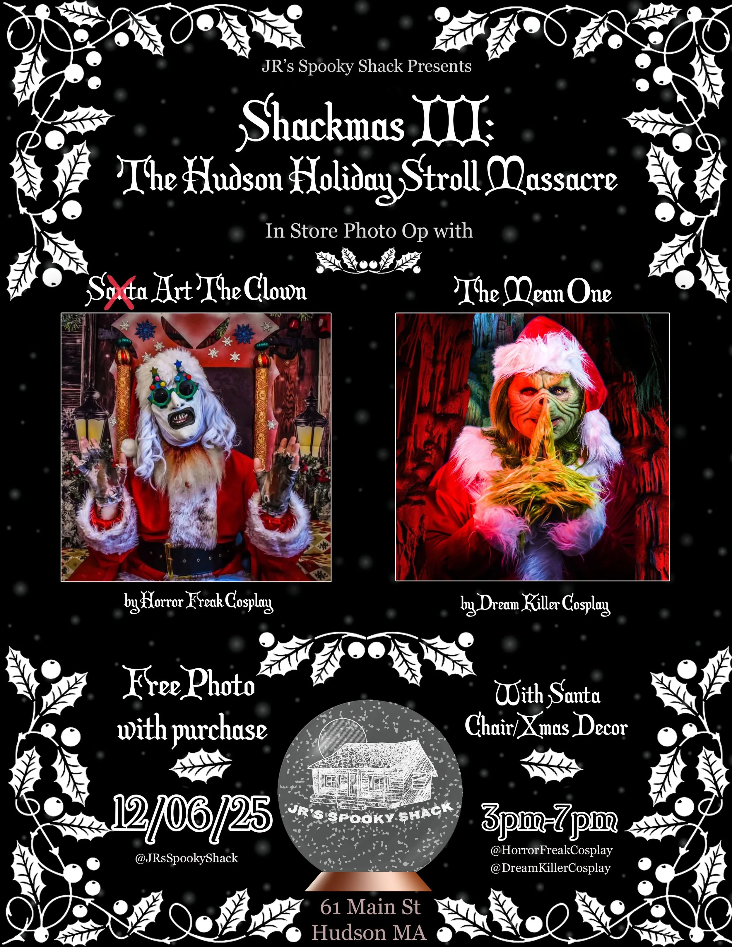 Both @dreamkillercosplay as The Mean One and @horrorfreakcosplay as Santa Art will be lurking around JR’s Spooky Shack spreading the Holiday Fear! Photos will be taken with them free with purchase!